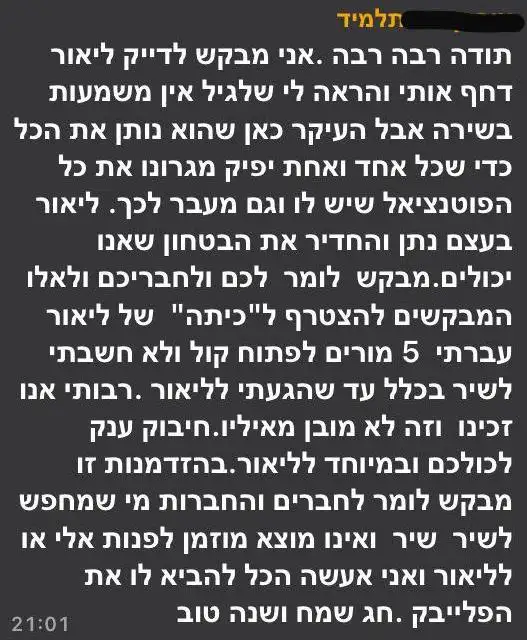 אני גאה ליצור קהילה תומכת ומפרגנת של זמרים, הכוללת את כל תלמידיי מכל הרמות. במסגרת השיעורים הקבוצתיים והמפגשים החברתיים, נבנית קבוצה של אנשים שמשתפים חוויות, תומכים אחד בשני ומתפתחים יחד.